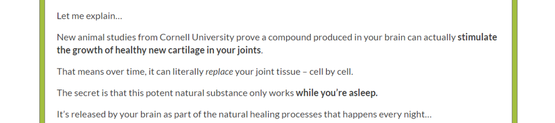 No research managed to find a real cure for joint pain or arthritis. That’s because it doesn’t exist any – medically speaking. What they claim doesn’t make any sense – that’s the point.
